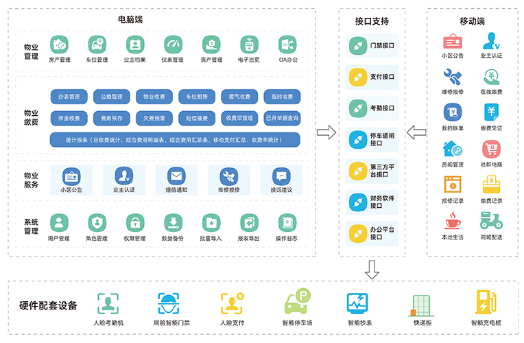 物业费、水电费、押金收费退费、临时收费、车位租售、暖气收费、费用预存等内容。